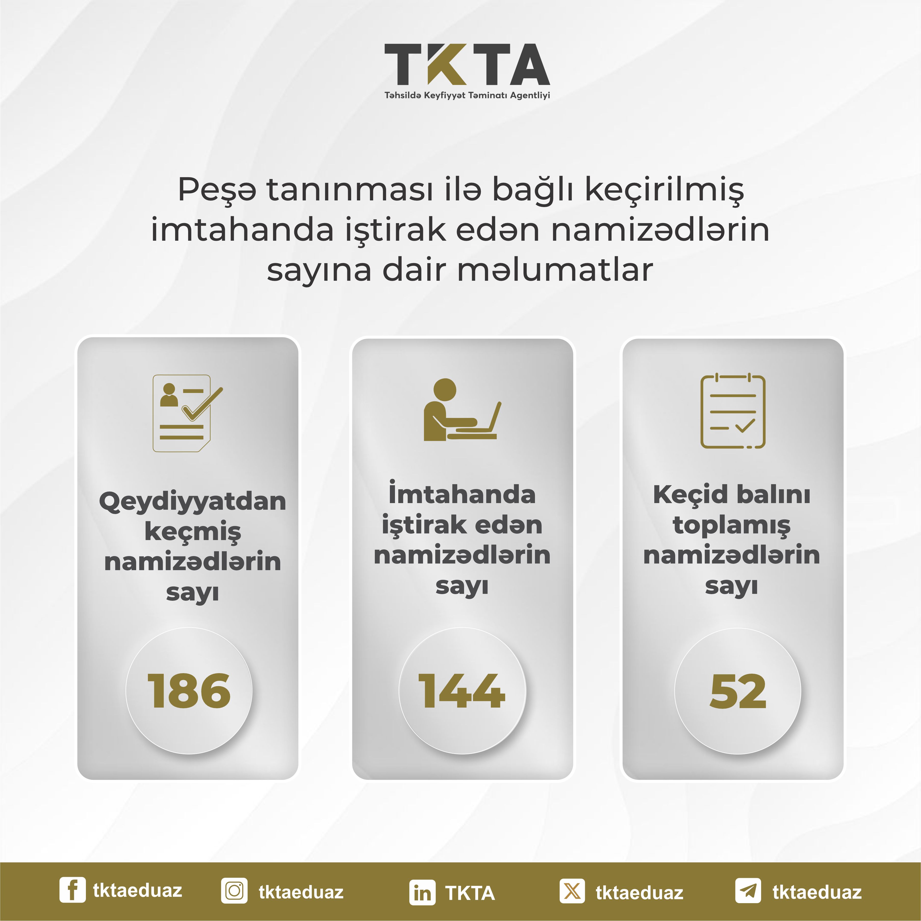 Bildiririk ki, 29 sentyabr 2025-ci il tarixində DİM tərəfindən keçirilmiş imtahanda iştirak etmək üçün 186 nəfər namizəd qeydiyyatdan keçib, bunlardan 144 nəfəri imtahanda iştirak edib, yalnız 52 nəfəri keçid balını toplayıb. 14 ixtisas üzrə müvəffəqiyyət göstəricisi 36% təşkil edib. İxtisaslar üzrə iştirak edən və keçid balını toplayan namizədlərlə bağlı statistikanı təqdim edirik.