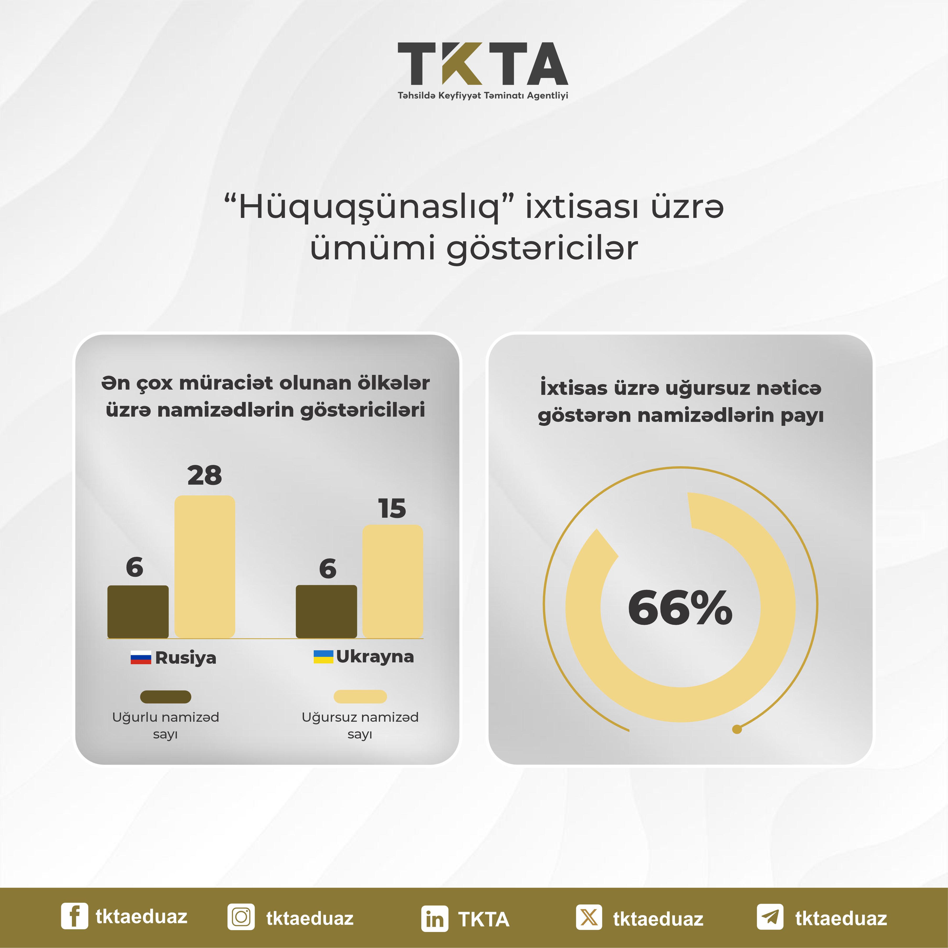 Beləliklə, “Hüquqşünaslıq” ixtisası üzrə peşə tanınmasını əldə etmək istəyən namizədlərin 66 %-i müvafiq imtahanda uğursuz nəticə göstərib.