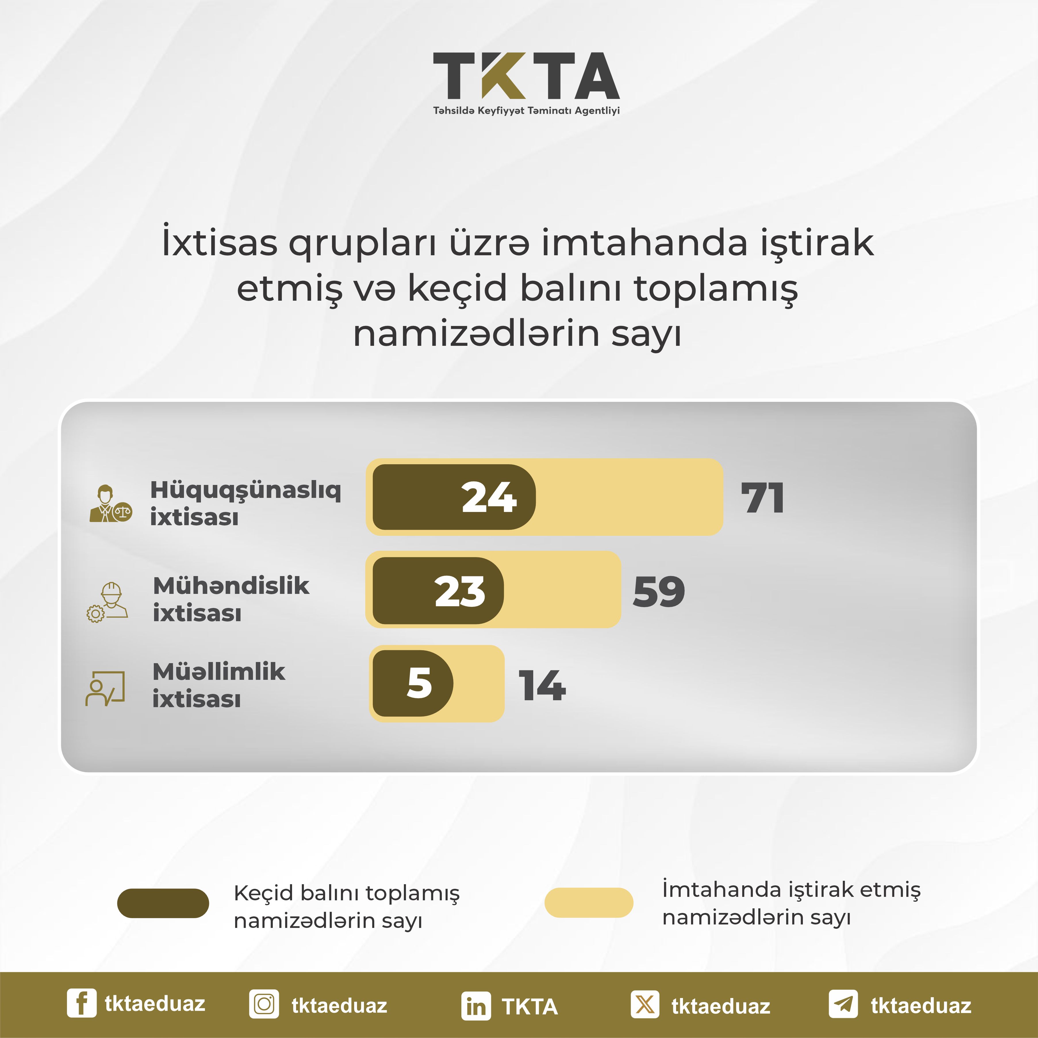 Belə ki, peşə tanınması imtahanında “Hüquqşünaslıq” ixtisası üzrə 71 nəfər iştirak edib, onlardan yalnız 24 nəfəri uğurlu nəticə əldə edib.