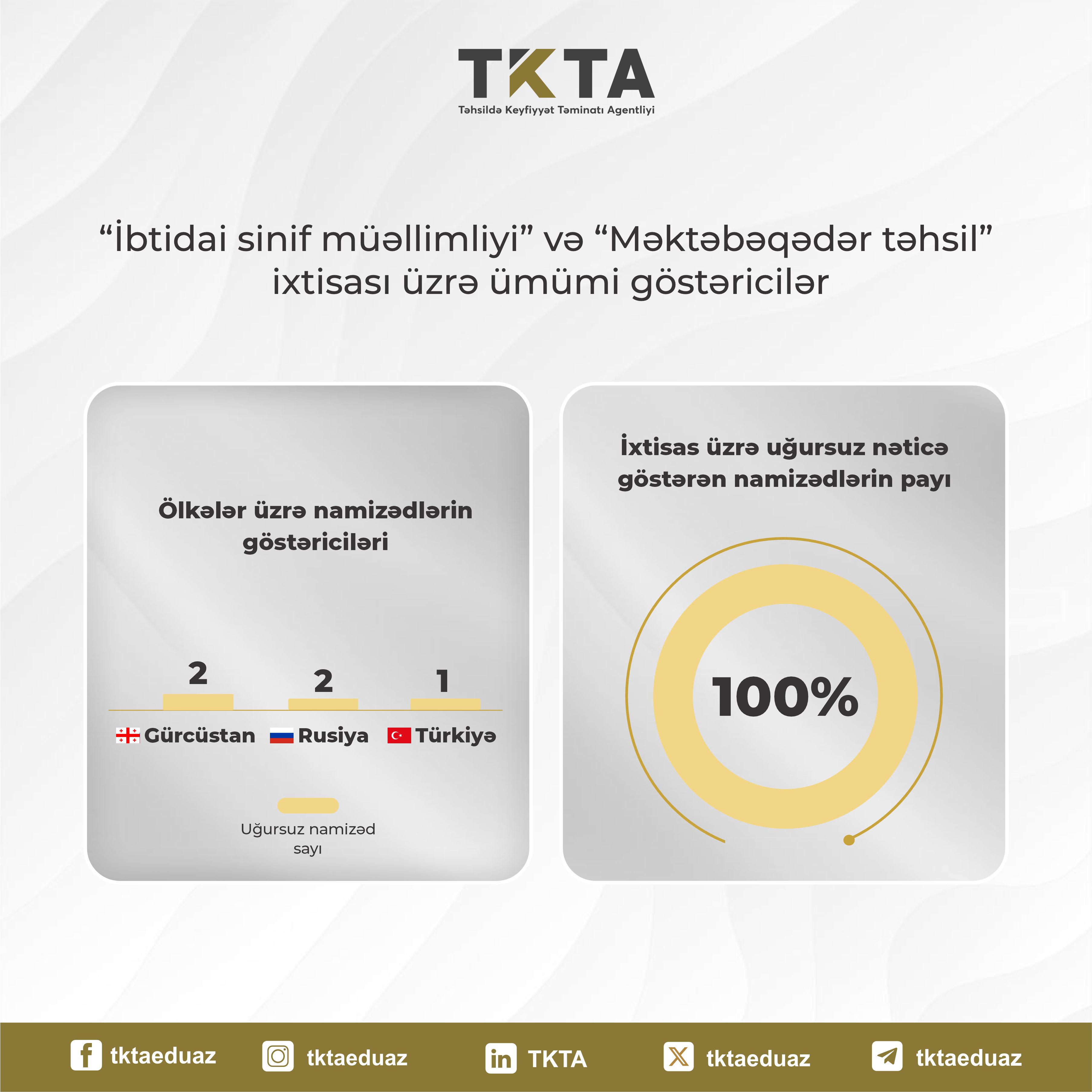 Beləliklə, “İbtidai sinif müəllimliyi” və “Məktəbəqədər təhsil” ixtisasları üzrə peşə tanınması əldə etmək istəyən namizədlərin 100%-i müvafiq imtahanda uğursuz nəticə göstərib.