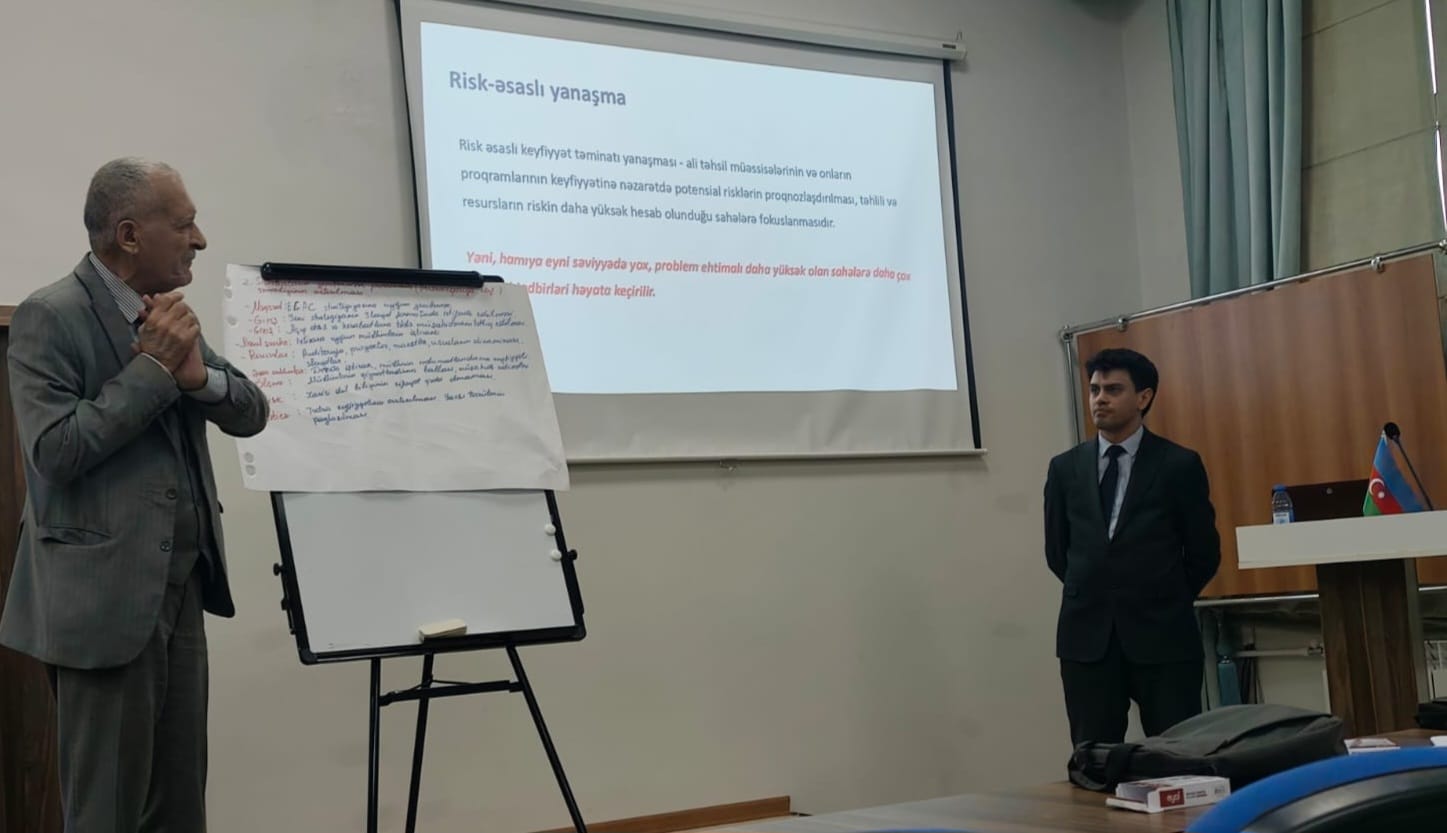 Təlim zamanı ali təhsildə daxili keyfiyyət təminatı sisteminin rolu, məqsədləri və effektiv tətbiq mexanizmləri, keyfiyyətin təminatı üzrə alətlər, eləcə də keyfiyyət dövriyyəsinin mərhələləri müzakirə olunub. İştirakçılar daxili keyfiyyət təminatı sisteminin planlaşdırılması, həyata keçirilməsi, qiymətləndirilməsi və təkmilləşdirilməsi proseslərinə dair praktiki nümunələrlə tanış olublar. Təlim TKTA-nın Təlim və metodologiya şöbəsinin əməkdaşı Vəfadar Rizvanlı tərəfindən aparılıb.